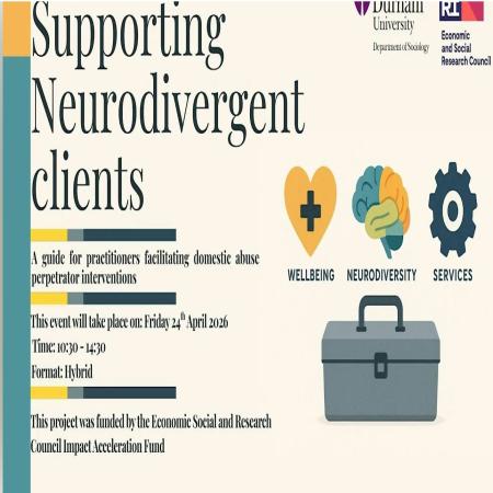 'Supporting Neurodivergent clients: A guide for practitioners facilitating domestic abuse perpetrator interventions' The Guide has been created due to the growing awareness that domestic abuse perpetrator interventions are attended by a neurodiverse population of clients. However, there has been less attention paid to the needs of Neurodivergent clients, and little guidance for practitioners on how to support them. It has been developed in collaboration with project partners from Community Justice Scotland (The Caledonian System), Probation North East (His Majesty’s Prison and Probation Service) and Respect (Make a Change), and in consultation with two neurodivergent-led organisations, Neurodiverse Connection and Monika Labich Coaching and Therapy. This event will take place on April 24th, 2026, 10.30-14.30. This will be a hybrid event, taking place in person at a Durham University location, and online. Due to room capacity, registration is for attending online only. The agenda will include an overview of the guide, presentations from project partners, and feedback from organisations that piloted the guide (10.30-13.30). The last hour of the event (13.30-14.30) will be an in-person networking event.